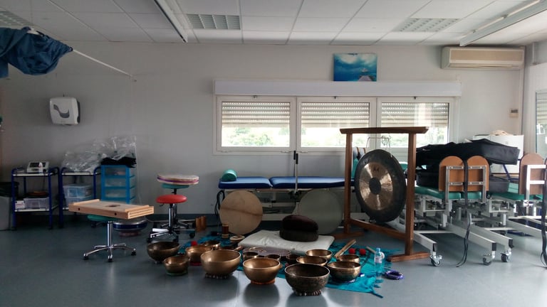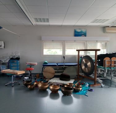 Confortablement installés ,les participants se laissent tout d'abord guider par ma voix pour une mise en évidence des ressentis corporels, et un début de détente.Au fur et à mesure, j'introduis les instruments pour finalement leur laisser toute la place.