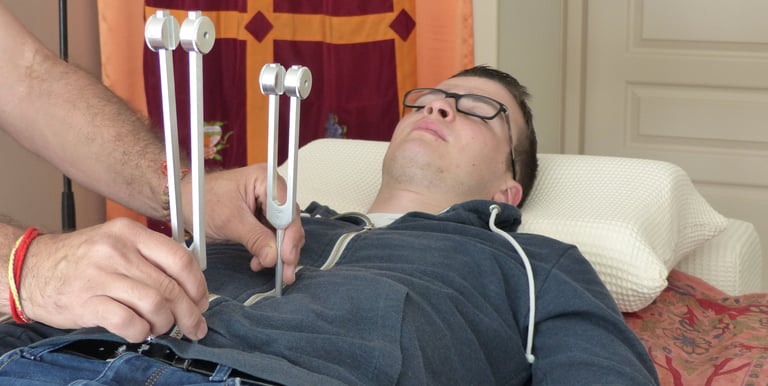 Les diapasons thérapeutiques utilisent le même principe de résonance vibratoire et sont appliqués sur des portes d'entrée énergétique, et au niveau de certains points d'acupuncture, mais sans l'inconfort des aiguilles !